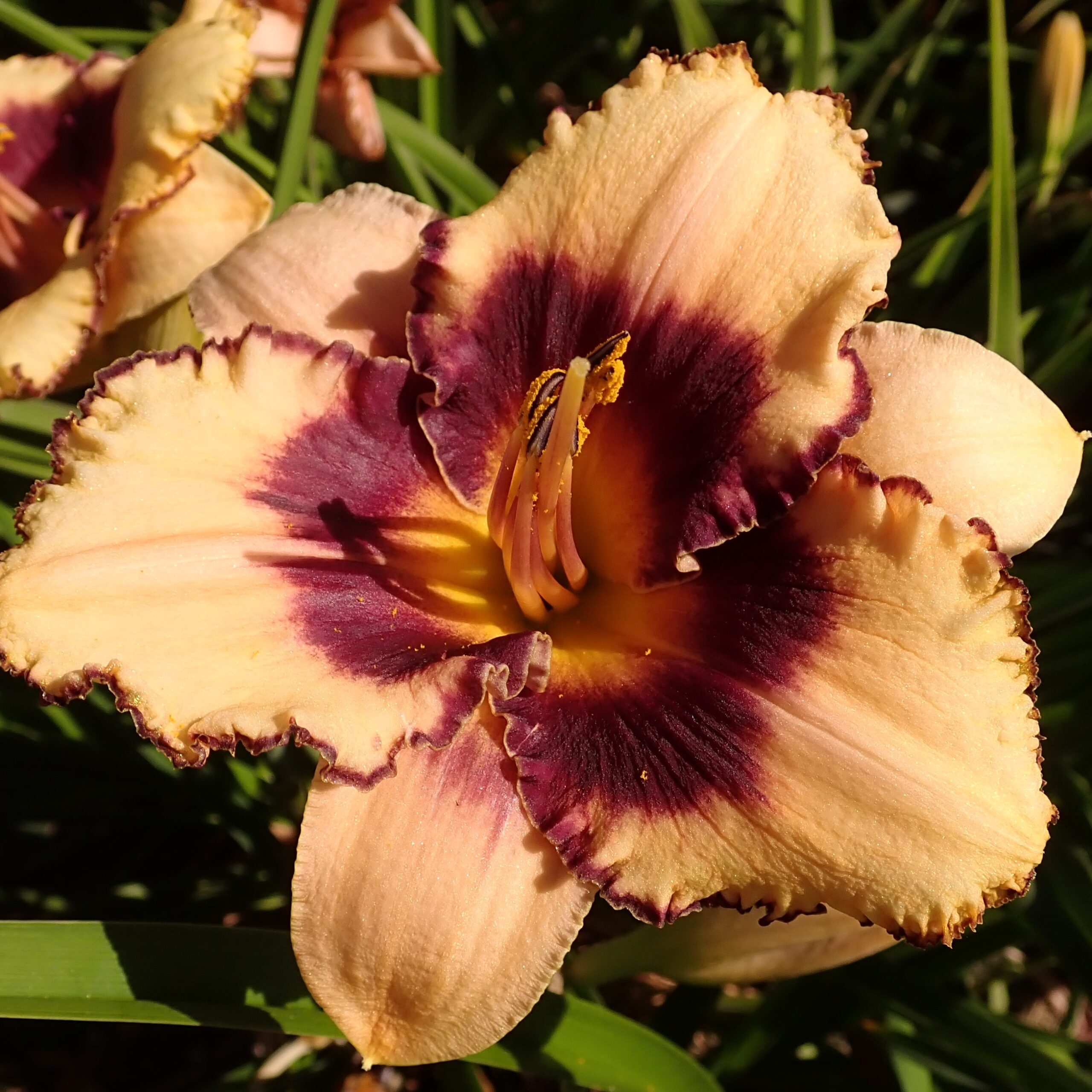 Рассада лилейника порадует потрясающей расцветкой. Лепестки окрашены в нежнейший кремово-бежевый цвет. Ближе к серединке они становятся пурпурными. По краям проходит темная контрастная окантовка. В центре соцветия находятся яркие желтые тычинки с черными пыльниками. Взрослый куст достигает высоты 65 – 70 см. Период цветения начинается в июле и длится 2 – 2,5 месяца. В это время сад наполняется чудесным сладковатым ароматом. За сезон повторноцветущий многолетник может давать до 30 цветоносов. На каждом из них образуется по 10 – 20 изящных цветков.
